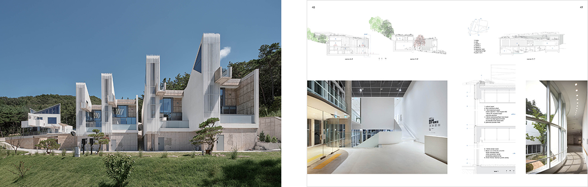 The K-Projects section examines three works that seep into the landscape while maintaining a tense equilibrium with nature. REST (Médongaule Restaurant) in Yangpyeong, designed by Pezo von Ellrichshausen, employs a massive grid structure on a gentle slope to offer a singular experience of repose, appearing suspended between topography and structure. Cultural Center Hodu by SsD nestles into a mountainside in Cheonan, flowing between five ancient cherry trees to preserve the site’s living memory and question the sustainability of nature. Finally, Intaglio by KDDH Architects on the coastal slopes of Buan explores the aesthetics of engraving—reorganizing the site through the depth of open space rather than overwhelming it with mass—proposing a profound dialogue between architecture and the earth.